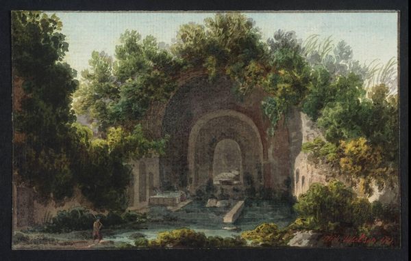 Barbara Dietzsch created this watercolor, "Landscape with caves, burial monuments, a river, and figures," in the mid-18th century. This work is fascinating because it exemplifies the complex artistic landscape of its time. The setting is classical, with ruins and figures populating an imagined landscape, yet it was made in Germany, far from the ancient world. The piece evokes the ‘Grand Tour,’ a rite of passage for wealthy Europeans, who traveled to Italy to study classical art and architecture. Dietzsch likely never took the Grand Tour herself but catered to the market for these romanticized, picturesque views. The crumbling monuments and figures recall a lost past but also a longing for a unified European cultural heritage. The study of prints, drawings, and travel accounts can reveal how artists like Dietzsch shaped and responded to their patrons' desires and the larger intellectual trends of the Enlightenment. The social conditions of the time shaped artistic production.