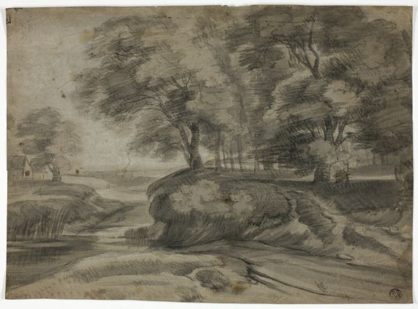 Editor: Right, so here we have "Landscape with Trees," a watercolor and pen drawing by Aelbert Cuyp, probably made somewhere between 1635 and 1691. There’s something quite melancholic about the color palette – lots of browns and greys. I’m really drawn to the texture of the trees, the way he's captured the light filtering through the leaves. What catches your eye most about this landscape? Curator: The air itself. Dutch Golden Age landscapes, you see, weren't just about accurately depicting scenery, they were about capturing atmosphere, feeling. Cuyp is doing something special with light here; it isn't simply shining, it's enveloping, it's… a presence. Do you get that sense too, the quiet intensity? I almost feel like I'm there, just breathing it in, wouldn't you agree? Editor: I do see it. I’m also interested in how seemingly simple the composition is, just some trees and a hint of a path. It's like a casual observation of nature. Is it, though? Is there something more profound at play, maybe regarding Dutch culture? Curator: Exactly! Simplicity is deceptive. These weren't 'snapshots.' They spoke of the Dutch relationship with their land, their hard-won territory. Those quiet paths weren't just routes; they represented journeys, both physical and spiritual, maybe. Look closely. Are there other figures? This isn't some grand vista of wild untamed space. There’s a clear indication of human presence. The fence implies control, perhaps safety or division of land. Maybe Cuyp is asking a question without using words. Editor: So it is like… the painting's stillness is where the statement lives. Very neat! It’s a more involved painting than I initially thought. Thank you! Curator: And *I*, have learned a new appreciation through *your* initial impressions. Art’s always a shared voyage, don't you find?
