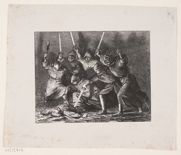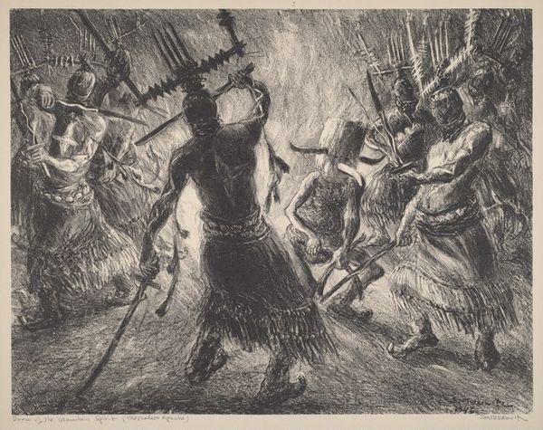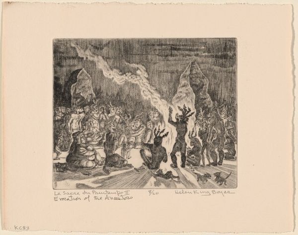 Curator: This is "The Call of the Night-Sweepers" by Auguste-Louis Lepère. It's striking how the artist captures the mood of this occupation. What's your immediate reaction? Editor: It feels somber and quite stark. You can almost smell the damp streets. I'm curious about the labour conditions depicted. Curator: Lepère, born in 1849, often focused on the lives of working-class Parisians. This print reflects their social reality and the burden they carried. Editor: The way he's rendered the textures of their clothing and equipment… you can feel the weight and coarseness of the materials. Curator: It's a powerful social commentary on class, illuminating the often-unseen workers essential to the city’s function. Editor: Definitely. The dark palette emphasizes the grueling nature of the work. Makes me think of the historical context of sanitation and public health. Curator: Lepère gives us a glimpse into lives often ignored, urging empathy. Editor: A strong statement through the act of printmaking itself. Curator: Indeed, revealing a world beneath the surface. Editor: Food for thought about the unseen labor in our own lives.