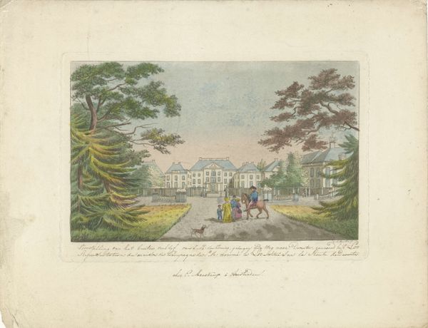 Jens Holm created this print of Charlottenlund Slot, an etching with hand-colouring. Immediately, our eyes are drawn to the symmetrical arrangement of the building, flanked by tall trees. Holm masterfully employs linear perspective, converging towards a vanishing point at the center of the mansion, creating a sense of depth. The soft, pastel hues evoke a tranquil and orderly atmosphere, reflecting the values of the period. The building, a symbol of power and status, is meticulously rendered, emphasizing its architectural details. Yet, the presence of human figures introduces a narrative element. These are signs representing social interaction and human scale. The hand-colouring, though delicate, adds a layer of artifice, drawing attention to the constructed nature of the image. Holm's work can be read as a sign, a symbolic representation of social order and aesthetic ideals.