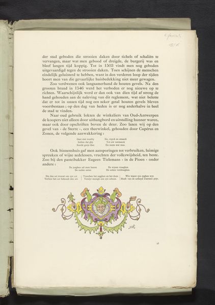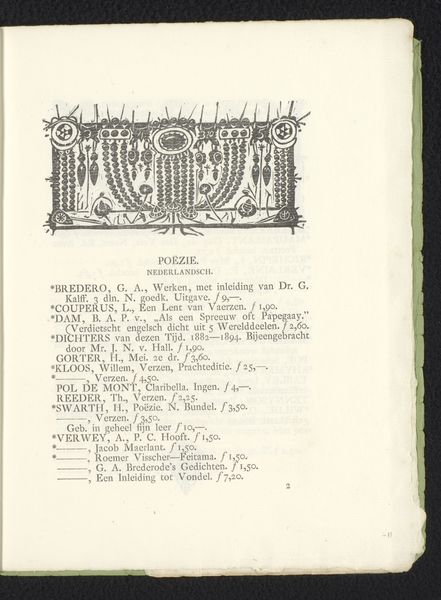 Curator: This vignet, or decorative seal, comes from 1893-1894 and is by Gerrit Willem Dijsselhof. I find it fascinating that it bridges graphic art, typography, and ornament so seamlessly. What is your initial reaction to this artwork? Editor: Well, the "Sluitvignet met sieraad" appears to be a simple page from a booklet; there’s something quite quaint and charming about it. It seems almost like a personal emblem. I notice the use of type, and a small jewel-like drawing right at the bottom. What do you see in this piece? Curator: What captivates me are the layers of symbolism embedded within this modest design. Seals historically represent authenticity and closure, carrying weighty significance for centuries. In the context of Art Nouveau, it embodies nature and growth through flowing lines and organic motifs, suggesting themes of creation, life cycles, and, perhaps, the very essence of artistic inspiration. Does this speak to you? Editor: Definitely, that makes me think of the bookplate designs of the time, acting like little emblems of personal identity and taste. So you see the jewel-like drawing as something that speaks to that world? Curator: Exactly. Also, remember this was produced in the Dutch Art Nouveau era; each flourish and carefully placed line would carry cultural weight, and recall memory within certain audiences of the time. The jeweler is suggesting craft. What did they want to emphasize? I believe these images are designed to spark a feeling. Editor: So the image served a practical purpose while embedding cultural meanings that viewers at the time would instantly grasp, right? The craftsmanship, the deliberate aesthetic choices...it all spoke volumes. Curator: Precisely! And, by extension, us today! A lovely summation; I'm glad we could delve a bit into its intricacies. Editor: I've certainly learned to see more than just a pretty little jewel now! Thank you.