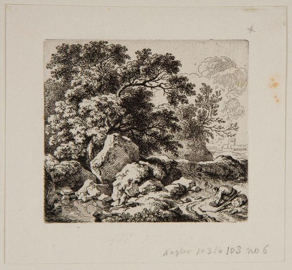 Editor: This is "Man Sitting at Foot of Two Crossed Trees" by Ferdinand Kobell. It is monochromatic, like a pen drawing, and the composition is complex. What strikes you when you examine this image? Curator: The intricate network of lines creates a captivating interplay of light and shadow, drawing attention to the formal elements. Note how the artist uses hatching and cross-hatching to build volume and texture. Editor: Yes, it gives a sense of depth to the rocks and foliage. What is the function of that contrast? Curator: Consider how the dense, dark areas contrast with the lighter, open spaces, creating a dynamic visual rhythm. This arrangement guides the viewer's eye through the landscape, focusing particularly on the figure seated at the base of the trees. Editor: I see what you mean! The figure becomes more prominent through that juxtaposition. Curator: Precisely. Observing such arrangements brings us closer to understanding the artist's intent. Editor: Thank you for illuminating that. I learned so much!