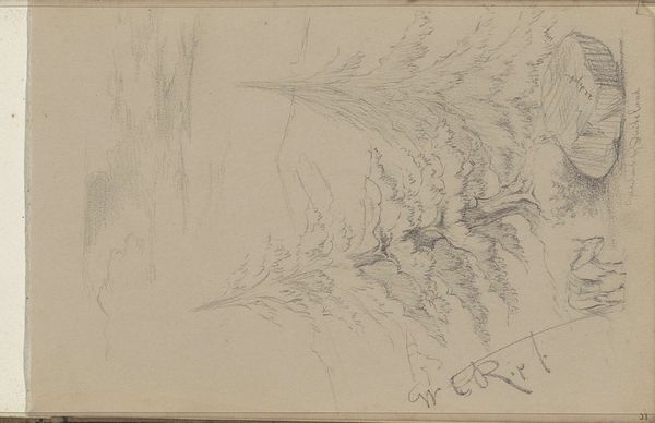 Curator: Here we have Charles Rochussen’s "Path between the Trees," a pencil drawing created sometime between 1840 and 1860, currently residing at the Rijksmuseum. Editor: Immediately, I’m struck by the contrast. The left panel has a darker, more imposing landscape feel, while the right side appears lighter, focusing on figure studies. It's quite striking. Curator: Rochussen was certainly working within the Romantic tradition here. His artistic output was clearly molded by the prevailing artistic climate of the period. The dramatic lighting and composition on the left speak to Romanticism's emphasis on emotion and nature’s sublime power. Editor: But how complicit was the artistic culture of the 1840s and 60s in representing, or perhaps obscuring, social realities? Looking at the figure studies on the right, what kinds of bodies are considered worthy of artistic attention, and how does that reflect broader societal power structures? Curator: The choice of subject reflects a broader societal interest in landscape and perhaps also portraiture through character study. Landscapes during this time were particularly resonant with emerging ideas of nationhood and identity, a source of artistic patronage in nascent political states. Editor: Landscapes can often serve as ideological stages. Are these just idyllic renderings of nature or do they tacitly support existing power relations of the time? I’m especially curious about the implications when figures are present or absent in such idealized depictions. Who gets to access this path, both literally and representationally? Curator: Certainly, it is productive to engage in these critical considerations that prompt examination of social forces shaping cultural narratives. Here, though, the quick sketching points toward capturing ephemeral moments of light or fleeting glimpses of form. Perhaps we observe not so much of the social context of visual culture and more of Rochussen's experimentation with form. Editor: Yet, by engaging critically with artwork, even with pieces seemingly detached from overt political narratives, we unveil historical and social layers that reveal underlying ideologies shaping artistic choices. We might discover even more if we had the means of accessing lost perspectives through intersectional discourse that engages multiple identities within cultural institutions, or we can reimagine what is seen in artworks in our new socio-political paradigm. Curator: Indeed, encouraging dynamic reinterpretations across varying identities fosters enriched dialogues—one goal in our public function of shaping understandings of art's place in culture. Editor: Exactly. Thank you. This discussion prompts further contemplation on how art and society intertwine, even in subtle, evocative works like Rochussen's drawing.