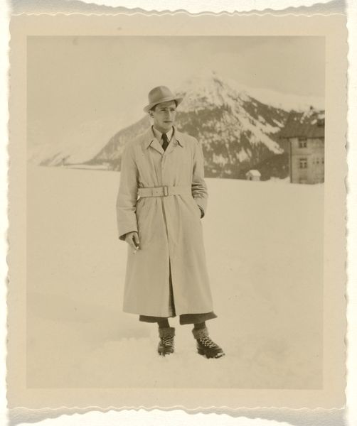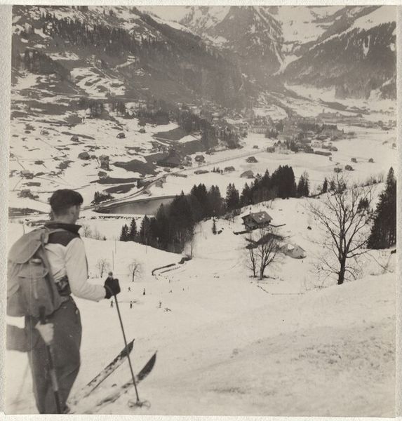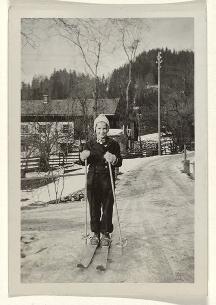 Editor: Here we have Robert Frank's gelatin-silver print, "Boy Waxing Ski—Sports," from around 1941. The grainy texture and stark contrasts create a really nostalgic atmosphere for me. What stands out to you about it? Curator: For me, the photo serves as a potent reminder of how leisure and recreation were marketed and consumed in the pre-war era. Note the setting; it seems staged, yet also hints at authentic engagement with nature and sports. Editor: Staged? You mean like it's advertising? Curator: Potentially. Look at the pristine mountain backdrop. And the focused young man performing this rather mundane ski-waxing ritual. Think about what kind of image was considered aspirational in that moment. Who had access to these leisure activities? Who was being excluded? The very act of documenting this scene normalizes and even glorifies a certain kind of lifestyle. Editor: So it's about the social context and who this image was for, more than the ski waxing itself. Curator: Precisely. The photo isn’t just a record; it’s a piece of visual rhetoric. Frank might be subtly commenting on social stratification even this early in his career. Consider, for example, how photography, even "documentary" photography, contributes to constructing societal values. Does the photograph subtly celebrate outdoor leisure, or is it capturing something about that moment in time? Editor: I hadn't thought about the implications beyond the surface. It is thought-provoking how a simple photograph of ski waxing could reflect so many socio-historical forces. Curator: Exactly. Looking closely allows us to decode the photograph, and see its significance beyond face value.