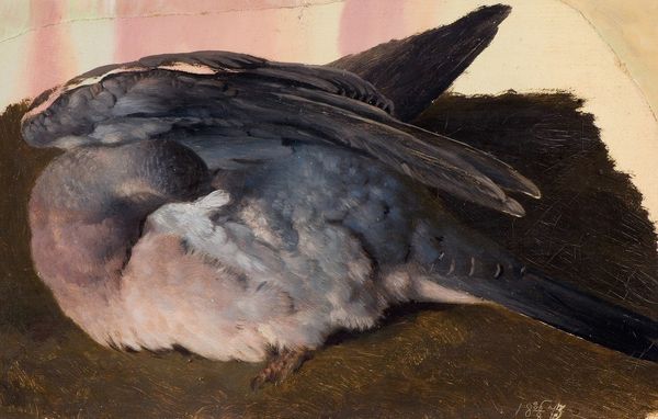 Curator: It’s a rather subdued piece, wouldn’t you say? Melancholy, almost. The dense shadows, the muted palette… Editor: That’s exactly what strikes me, that brooding stillness. A feathered darkness against a softening landscape. I almost feel like an intruder here. Curator: Intruder? The painting is Ferdinand von Wright's “Black Grouse,” created in 1864 using oil on canvas. As an artist of the Romantic era, von Wright consistently focused on Finnish wildlife. Grouse, in particular, appear repeatedly in his oeuvre, signifying Finnish national identity. Editor: Yes, and even that nationalistic framing is complex! Consider that at this time, Finland was an autonomous part of the Russian Empire. The painting seems less a straightforward celebration and more an assertion of a distinct identity in a landscape under pressure. What does the figure of this darkly plumed, quiet bird symbolize under those circumstances? Curator: I believe its most prevalent symbolic association remains one of reserve and connection with the natural world. The Black Grouse embodies this silent, enduring strength, the ancient spirit of the forest itself. And given that its eyes are almost hidden from view, they are symbols of intuition and foresight, in turn symbols of an indomitable presence. Editor: While I appreciate that interpretation, to me the obscured eyes signal vulnerability rather than insight. Nestled on its bed of moss, surrounded by tree trunks almost as a shield, it suggests a cautiousness and resistance in the face of vulnerability—and indeed a more subtle political symbol! The way the landscape presses around the bird reinforces this tension, between belonging and self-preservation. Curator: Regardless, the painting technique is meticulous. See the feathered details! But also note that von Wright did not pursue hyperrealism but rather aimed for the atmosphere of the Finnish forest. Editor: An atmosphere heavy with implication. These kinds of works remind us of how deeply political even nature can become when rendered onto a canvas. Curator: Indeed, a visual metaphor for resilience. Editor: It is compelling, really. It’s like glimpsing a coded message, hidden in plain sight.