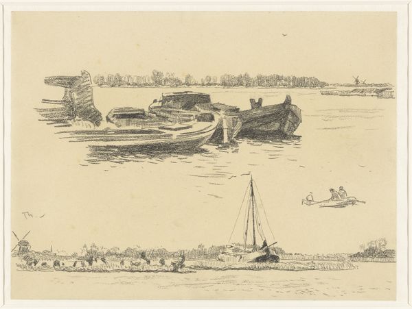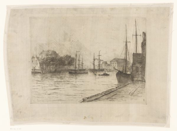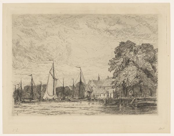 Carel Nicolaas Storm van 's-Gravesande made this etching titled 'Scheepswerf in Muiden'. In this evocative etching, the Dutch artist captures a bustling shipyard scene, redolent with the spirit of labor and maritime industry. The image is a window into the Netherlands' rich history as a seafaring nation. 's-Gravesande, active in the late 19th and early 20th centuries, positions himself within a tradition of Dutch realism, yet his choice of etching lends the scene a modern, almost Impressionistic feel. As the Industrial Revolution swept across Europe, the Netherlands experienced its own transformations, and this work might be seen as a commentary on the intersection of traditional crafts and burgeoning industrialization. The location, Muiden, with its strategic importance for trade and defense, further contextualizes the print within the nation’s economic and military history. To understand such a work more fully, we can consult period sources: trade records, local histories, and even maritime journals, bringing the social and institutional history to life.