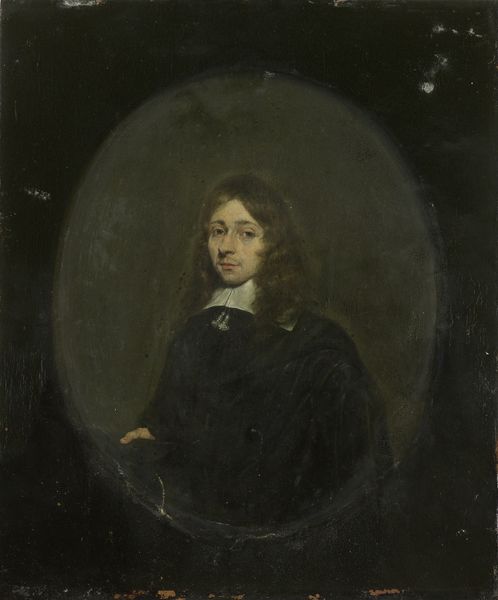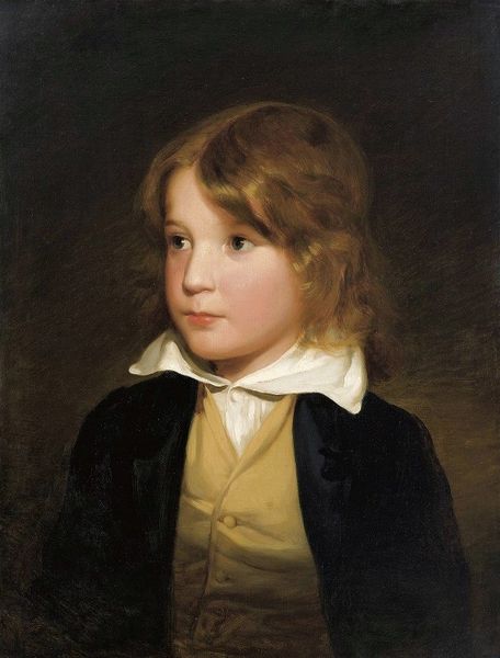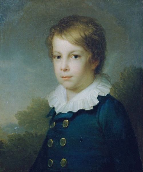 Editor: We're looking at a portrait of Leopold, Duke of Brabant, an oil painting. While it has an academic art style, there's a real softness to the lighting, almost like it's staged for romanticism. What details strike you most when you observe this artwork? Curator: I'm particularly drawn to the contrast between the subject's attire and the atmospheric backdrop. The young Leopold is presented in dark, tailored clothing, sharply defined against the loose, almost dissolving forms of the landscape behind him. How do you perceive the balance in color between his figure and the scenery, as this could denote what exactly the author wanted to express in their portrait? Editor: I notice the neutral tones of the landscape surrounding the subject really allows the author to draw my attention toward Leopold’s bright skin, specifically, his hands and face. How do you interpret his form in relation to the tonal value contrast with the environment? Curator: Note the texture—smooth, almost porcelain-like, for the skin versus the more impastoed brushwork of the landscape. Semiotically, that tactile difference can symbolize the subject's refined status separate from the natural world. It’s fascinating how the painter employs opposing styles to demarcate class. Editor: That’s interesting! It really does make Leopold feel detached from nature itself. I can imagine the soft quality of the painting as almost dream-like; I’ve noticed, additionally, that one hand is holding what seems to be a military hat. Does this portrait then seek to portray his innocence or duty? Curator: The form follows this ambiguity of status and growth into adulthood. The almost delicate portrayal, offset by this strong attire, provides contrast of the painting that elevates its importance and tone. So, with Leopold the message becomes complicated by what these colours represent in contrast and in relation to each other. The symbolism is ripe for analysis. Editor: I never looked at it that deeply before. Thank you! Curator: Of course! We can discuss the relations between form, value, and class when dealing with fine art any time.