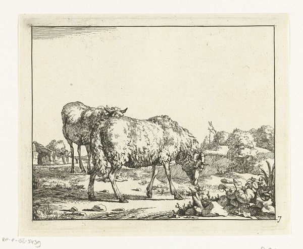 Editor: This is "Landscape with a Cow and Goat near a Spinner" by Jean Louis Demarne, dating sometime between 1762 and 1829. It's an etching, giving it a sort of aged and delicate feel. It feels almost like looking into a past world, everything depicted feels quite serene, a peaceful simplicity about it. What catches your eye about this piece? Curator: The most striking thing is how it represents the complex interplay between the idealized pastoral life and the realities of labor in the 18th and early 19th centuries. The woman spinning wool, seemingly unburdened by the supposed hardships of rural existence, next to farm animals in what we now may regard as "quaint"—but, for those times, this genre painting may have carried a lot of political message! Editor: Political? How so? It seems a pretty straightforward depiction of country life. Curator: Well, think about the intended audience and how they would have perceived these kinds of scenes. Was Demarne trying to romanticize rural labor, potentially obscuring the social and economic disparities present at the time? How much artistic agency do we really give to works, especially prints like these? They usually come with very charged sociopolitical landscapes. Editor: That makes me consider it from an entirely new angle. The idealized portrayal, perhaps meant to appease the elite rather than reflect reality. Curator: Exactly. Now think of the museums it might have ended up hanging at and the impact it creates when portraying something so mundane. Editor: It’s incredible how a simple image can hold such a complex history and meaning. I’ll definitely be thinking about that when I see similar genre paintings now. Curator: Indeed. The political economy of art is ever-present, whether it explicitly seems that way or not.
