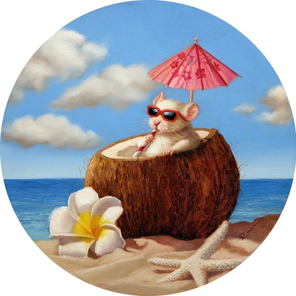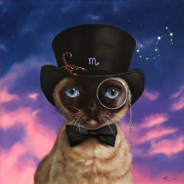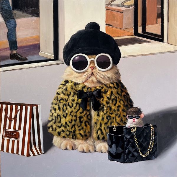 Lucia Heffernan painted this artwork with an unknown medium. The circular format immediately invites us into an intimate, almost voyeuristic, scene. An owl adorned in human-like accessories—a pearl necklace and a wide-brimmed blue hat—sits poised at a table set for tea, a worm poking out from the teacup. Heffernan destabilizes established meanings by placing the owl, a symbol often associated with wisdom and watchfulness, into a domestic setting that implies human social rituals. This juxtaposition of the wild with the civilized creates a curious tension, challenging our fixed notions of nature versus culture. The use of contrasting elements, such as the raw worm against the delicate china, further reinforces the unsettling of values. The formal elements of color and composition work together to emphasize this theme, inviting us to consider how these pairings confront established roles. The artist’s careful construction suggests a broader discourse about the complexities of domestication.