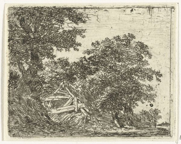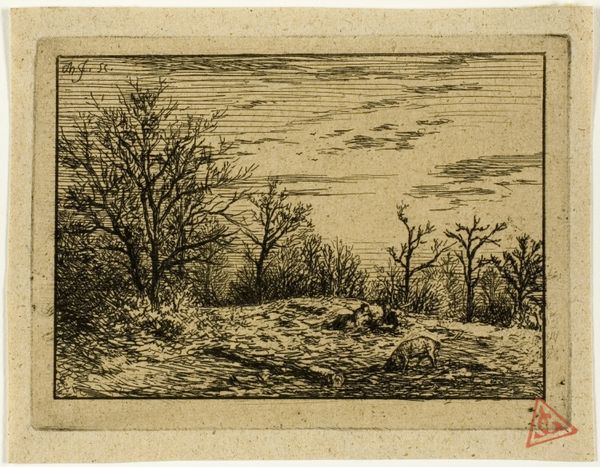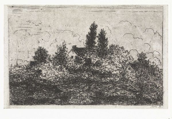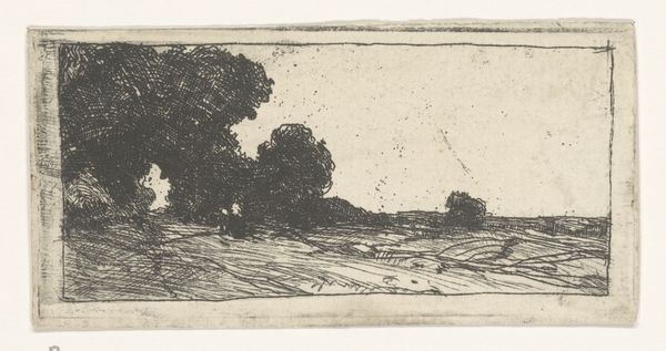 Editor: This etching, "Landschap met één hoge boom" - Landscape with one tall tree - by Arnoud Schaepkens, dating from 1831-1904, really strikes me with its starkness. The lines are so deliberate, almost frantic. It's both bleak and kind of beautiful. What do you see in this piece? Curator: Bleak is an interesting word, I like that! To me, it feels like a raw, intimate observation of nature's quieter moments. Schaepkens clearly revels in the simple poetry of a single tree dominating the horizon. Think about how an etching captures light - or perhaps I should say, it captures the absence of it - using these delicate lines to build form. It's a little like a musical score to nature. Doesn’t that resonate with you? Editor: I can see that, definitely the musical score analogy! But there's still something about it... the way the lines almost vibrate on the paper. It doesn't feel peaceful exactly, more like a moment suspended in time. Almost lonely, that tree against the sky. Curator: Lonely is insightful. The Romanticism movement really valued individual emotion, didn't it? A tree isolated in nature became a kind of mirror for human feelings. Is it loneliness or a strength born of solitude that you sense? Does that alter its power for you? Editor: I guess maybe it’s a bit of both. I still lean toward lonely, but seeing that duality is something I hadn’t considered before. The strength makes it less depressing somehow! Curator: Precisely! It’s this conversation – between light and shadow, solitude and strength - which lets the landscape speak, isn’t it? And the quiet becomes deafening.