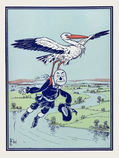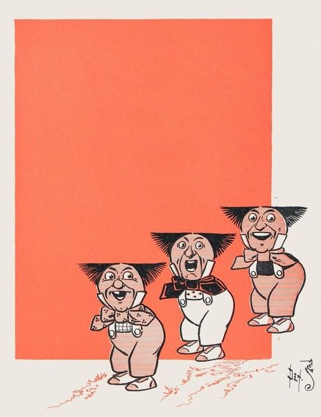 Editor: This is William Wallace Denslow's print from 1900, entitled "The head shot forward and struck the Scarecrow." The composition is pretty wild, with the three menacing figures looming over this… chaotic scene below. What's going on here? How do we interpret it? Curator: It’s useful to remember the social context. Denslow illustrated the first edition of "The Wonderful Wizard of Oz". This print isn’t just whimsical; it taps into anxieties about industrialization and its effect on the common person. Do you notice anything peculiar about the forms depicted? Editor: Well, the Scarecrow’s clearly being attacked, but...the attacker looks almost…detached, like a puppet without strings. Curator: Precisely! It represents the dehumanizing potential of industrial labor, with individuals reduced to mere cogs in a machine. These characters aren’t people but stylized caricatures designed for mass appeal. Consider, who does this imagery benefit and what norms is it reinforcing? Editor: So, even though it's a children's illustration, it's making a pretty sharp commentary about labor conditions and class? It's pretty dark for "The Wizard of Oz". Curator: The "Oz" books and related art were immensely popular, subtly shaping public perception of labor and authority. Denslow was an avowed socialist, by the way. Now does that knowledge change your perspective of the art? Editor: It certainly does! It reveals a hidden layer of meaning within the seemingly innocent depiction. I initially saw slapstick but it's trenchant social critique wrapped in the garb of children’s literature. Curator: Indeed. Analyzing art means understanding the political currents that run through every piece. Editor: This makes me rethink what I know of this artwork. I will now always remember the artist's personal beliefs and historical events while trying to decode its meaning and visual motives. Thanks!