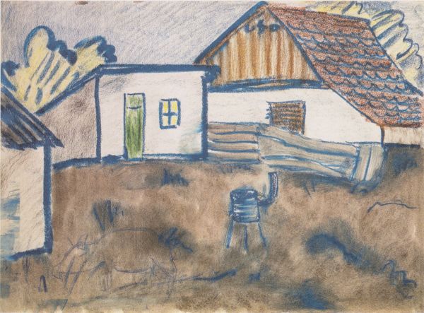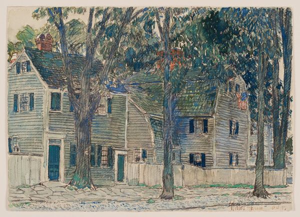Editor: We’re looking at “Home Sweet Home Cottage” by Childe Hassam, created in 1917. It's a vibrant sketch, almost feverish in its rendering of a quaint cottage. What draws me in is this intense layering – the way the house seems to both emerge from and dissolve into the landscape. What do you see in this piece? Curator: This house, wouldn't you say, evokes not just shelter, but perhaps a sense of idealized American life during a very tumultuous time, painted during World War I? Editor: Yes, that's interesting. So the "Home Sweet Home" isn't just a description, but a yearning, perhaps? Curator: Exactly. Consider the composition – the house dominates, but it's enveloped by foliage. Is this a sanctuary, protected, or is it being overtaken by nature, a symbol for something in decline, slowly being engulfed in nature as a symbolic motif for something passing away? It appears almost vulnerable amidst the perceived safety of foliage and flora. How does the artist employ these techniques, of color, shape and form? The green foliage for instance, in this context, and against the backdrop of the house: is there a subtle but present reference? Editor: That contrast is definitely there, highlighting this sense of both security and unease. Is it me, or does the overall image, and especially this green 'shield' present a kind of hope amongst uncertainty, through symbolic colour, form and content? Curator: Perhaps so. Colour, form, and line work together. Hassam perhaps wants us to find beauty even within uncertainity. Perhaps that's also what you learn here, to understand what we see from art and what you can learn and see and read inside its world. Editor: That's such a fascinating lens through which to view this piece, seeing how personal and cultural anxieties intertwine to create a lasting and evolving iconography.