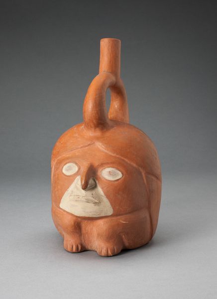 This portrait vessel of a ruler was crafted by the Moche people with paint on earthenware. The vessel presents a face divided by color. One half is a terracotta hue, the other an understated reddish-brown. The face’s symmetry is contrasted by the asymmetrical color scheme. Above, a patterned headband sits atop the figure's head. The vessel is completed with a stirrup spout, a characteristic design that merges function with form. The dichotomy of color invites a semiotic reading. One could consider if these colors denote the dual nature of power, perhaps the balance between governance and military strength. Or, the colors may relate to a more profound concept, the delicate balance between opposing forces. The vessel's three-dimensional form adds to the artwork’s communicative power. Consider how the vessel, as an object, might have played a role in Moche society, perhaps in rituals to convey the weight and multifaceted nature of leadership. Today, its form and colors continue to speak, inviting reflection on the structures of authority and the symbolic language of ancient art.