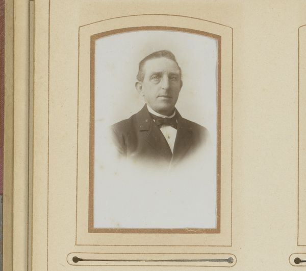 Editor: So here we have "Portret van een jongeman," or "Portrait of a Young Man," believed to have been taken sometime between 1860 and 1880. The image is an old photograph on, presumably, a card. There is such a melancholy air about this fellow... almost shy. What strikes you when you look at this piece? Curator: It feels like stepping back in time, doesn't it? There's a stillness that old photography captures, a kind of arrested moment that invites speculation. Look at the soft focus – not quite sharp, which gives him a dreamy quality. The bow tie and the formal jacket, the careful grooming... this was clearly a significant moment, perhaps a rite of passage captured for posterity. I wonder what dreams he held. Does it make you ponder on that concept as well? Editor: Absolutely! I guess I hadn’t thought of it as dreamy, but more a capturing of identity... but I guess those concepts overlap. Was there any common expectation, as far as the sitter was concerned? I mean, did all of these shoots try and convey, in a ‘realistic’ style, something essential about the sitter? Curator: Ah, an excellent question. The move to "realism" in the Victorian Era was meant to provide truth and direct observation, often steering clear of overt sentimentality, but I think the most successful attempts also speak to this. And that requires something more... to suggest, perhaps, not just what they *were*, but what they *hoped* to be. Do you think that element is missing here, present or perhaps in tension with his circumstance? Editor: I’m thinking perhaps I feel the 'realistic' aspect in the visual style, and then hopefulness, well, now I am picking it up from his posture, maybe? Thank you, this has made it far more clear for me! Curator: The magic of interpretation! Glad to have stumbled into this discussion with you; seeing art through someone else's perspective always deepens the experience.