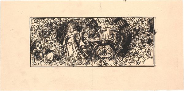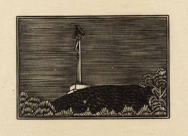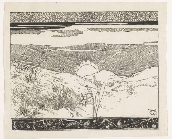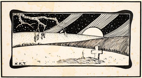 Curator: Welcome. I'd like to draw your attention to "Path in the Field" by Haralampi Tachev, an ink and pen drawing. Its style immediately evokes a sense of pastoral quietude. Editor: It feels dreamlike, almost… the heavy ink contrasts with the openness of the field, giving it a sort of melancholic charm. I'm particularly drawn to how stark the landscape is. Curator: The starkness speaks to a modernist engagement with nature, one that eschews romanticism for something more grounded. Tachev's choice of simple ink and pen contributes to this, avoiding color and focusing on form and line. The limited palette is in fact really striking and pushes this pen drawing beyond a traditional landscape scene. It creates a visual narrative about nature that’s about line and form over realism. Editor: Absolutely, the focus on geometric elements is prominent, almost as if deconstructing a traditional landscape. Note how the black ink dominates much of the picture’s upper-half – what do you make of that symbolical decision? Curator: The darker sky hanging over the brighter, meticulously drawn path could represent encroaching industrialization and urbanization threatening traditional rural ways of life in Eastern Europe in the early 20th century. This wasn’t some simple vista, but an interrogation. Editor: An interesting interpretation. But I also feel that the white path itself evokes a powerful symbol of freedom. It reminds us to embrace possibility but with the knowledge that these possibilities can and might get darker and scarier. The choice of ink brings a starkly emotional mood. It makes you think more of night than of day. Curator: Perhaps both anxieties and freedoms coexist here, entangled in this beautifully rendered path. Editor: Ultimately, Tachev delivers a piece that uses imagery to confront themes relevant during the artist's life, but relevant now in so many crucial aspects. Thank you.