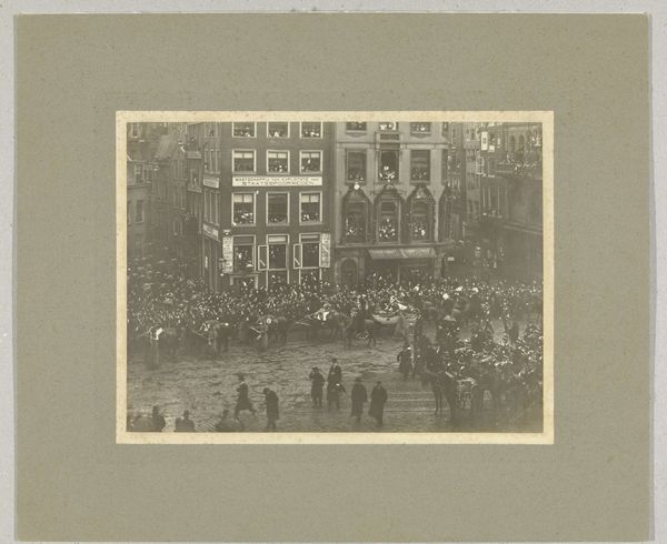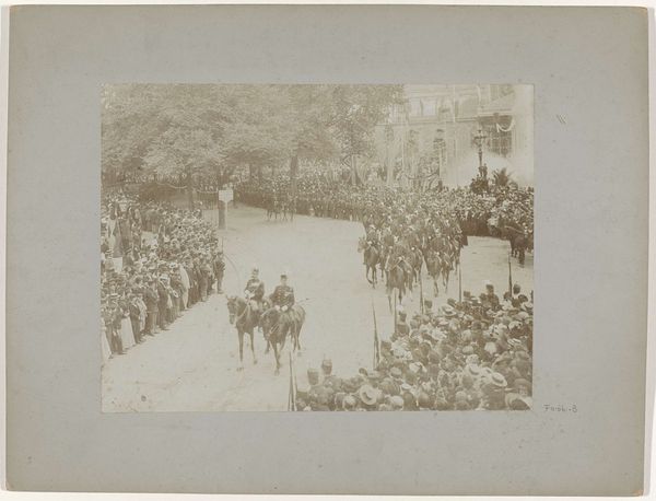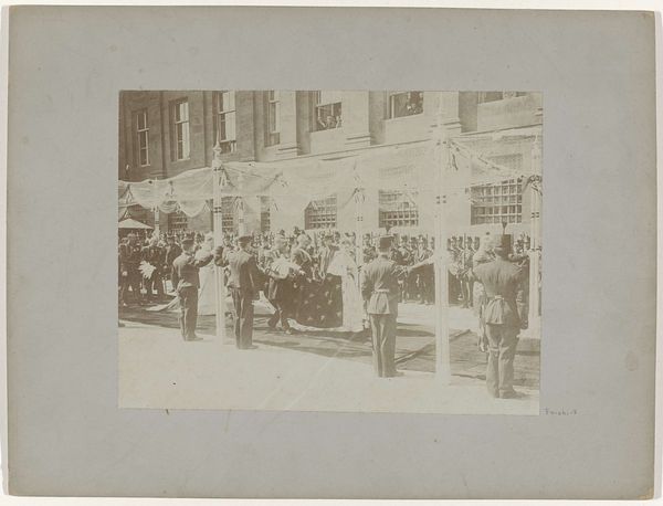 Curator: I must say, the monochrome aesthetic of this photograph truly encapsulates a bygone era. It's "De Gouden Koets voor het Rijksmuseum bij de inhuldiging van koningin Wilhelmina," snapped by Albert Greiner in 1898. Editor: Immediately, I sense a sort of dignified tension. A formal procession caught in a hushed, sepia-toned world. Does it evoke nostalgia or restraint? Curator: Well, as street photography, its composition is interesting. Greiner captures the grand scale of the event, but there's also an emphasis on the rigidity and formality. See how the lines of soldiers mirror the architectural precision in the backdrop? Editor: Yes! And the use of light seems to mute individual features in favor of structural form. Consider how it flattens perspective even as it expands space. I feel a deep structural paradox. Curator: Perhaps, Greiner wasn’t simply documenting; he might have been framing royalty with a particular visual vocabulary—order, tradition, power through architectural allusion. Think of the Dutch landscape tradition melding with urban ceremony. Editor: You know, I initially felt almost stifled by the composition’s apparent coldness, the very calculated nature of its staging. Curator: Perhaps that was precisely the point—Greiner understood not just how to record the event but how to transmit a controlled narrative of power and legacy in visual form. It’s more than just street-level; it's state-level, even. Editor: You’ve spun the narrative into a deeper understanding for me. It’s almost like discovering beauty through conceptual excavation rather than immediate appeal. A unique lens on power structures! Curator: Indeed! What we perceive initially as austerity opens into a compelling statement about visual codes of leadership.