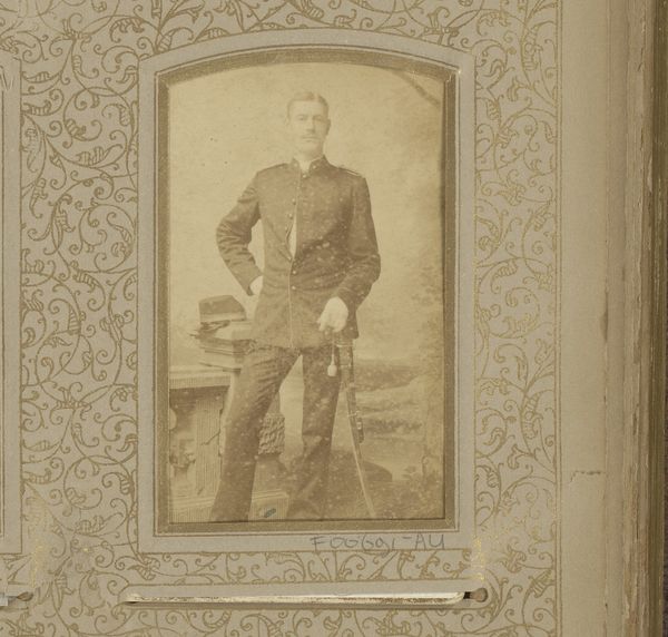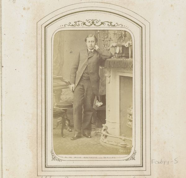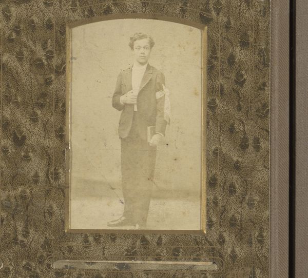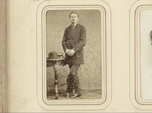 This is a photograph by Bernhard Hoffman portraying a man in formal attire, hat in hand. It captures a moment laden with symbols of social status and decorum. The hat, often seen as a mere accessory, carries a rich history. In earlier times, removing one's hat was a mark of respect, seen in countless images across cultures, from religious veneration to social interactions. The hat in hand suggests deference or humility. Yet, there’s a subtle tension: the man’s casual pose, hand in pocket, leans against the table. This posture indicates a modern ease, contrasting with the strict social rituals of hat etiquette. Consider how these gestures echo through art history, evolving through societal shifts. The act of covering or uncovering the head has traversed time, undergoing multiple interpretations. As you view this photograph, ponder how it communicates unspoken narratives of respect, status, and the quiet shifts in social expectations.