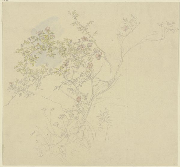 Carel Adolph Lion Cachet created "Bloemenstudies in paars en roze" using graphite and watercolor on paper. These are humble materials, more allied to sketching than finished painting. The wispy graphite lines seem to trace out the underlying structure of the flowers, while watercolor washes delicately capture the subtle gradations of pink and purple, giving them a sense of depth. It's a process that is quick, immediate, and spontaneous. Cachet was well-versed in both the fine and applied arts, and this piece reflects that straddling of categories. The visible process in this work aligns it more with craft traditions, where the artist's hand is evident, and labor is valued. The light touch suggests a quick study rather than a highly labored composition. Understanding the materiality, the making, and the context helps us appreciate the rich and diverse nature of Cachet’s practice, and how it challenges conventional distinctions between fine art and craft.