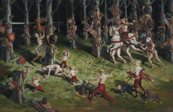 Editor: Before us is Lucas Cranach the Elder’s “The Crucifixion,” an oil painting from 1538. Curator: The overall feeling I get is one of oppressive density. There’s an almost claustrophobic crowding of figures beneath the crosses. Notice how Cranach utilizes the stark contrast of the figures against the tumultuous sky to amplify the tension. Editor: It's interesting how Cranach synthesizes Christian iconography with very earthly and local visual codes. We see the central scene of Christ's crucifixion, flanked by the two thieves—traditional elements—but the people below, they're rendered in very specific contemporary dress. That adds a very strong element of commentary about his present day. Curator: Yes, observe the layering of forms—the spears create strong diagonal lines that converge toward Christ, which leads the eye directly to the emotional and structural core of the piece. This use of perspective creates both a physical and psychological sense of depth, compelling us to empathize with the central figure. Editor: The repetition of upward-pointing lances and sorrowful faces definitely compels the viewer to meditate on the consequences of human actions, which Cranach may have intended given his ties with the Protestant Reformation. Even the landscape almost seems to participate in the drama; do you note the tumultuous, roiling clouds gathering around the scene? Curator: And isn't the limited color palette contributing significantly to the overall sobriety? Cranach relies primarily on earthy tones—ochre, browns, greys. He saves the brighter hues to highlight specific moments or figures like the mourning figures gathered near the lower-left quadrant. Editor: Yes! Color becomes a carrier of meaning here. In their grief, the figures huddled in blue garments recall the symbol of Mary, as intercessor, as symbol of hope in face of pain, reinforcing that even in dark times there is always light that persists and guides. Curator: The dynamism achieved through these compositional decisions underscores the inherent paradox of the scene: tragedy is shown with a promise of redemption. Cranach brilliantly exploits visual and symbolic languages, in order to create an almost suffocating emotional density in what he's rendering on this surface. Editor: It’s remarkable to note the detail with which the painter explores a universally relevant theme by way of this single historical moment. Curator: A powerful exercise in both pictorial construction and dramatic articulation, undoubtedly.