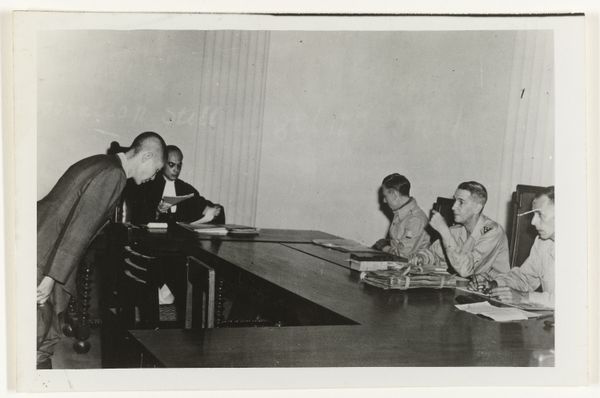 This photograph of G. Marshall, R. Schuman, and E. Bevin in Paris, was taken by Rene Helier sometime in the mid-20th century. It's like a study in grey, isn't it? The way the light falls, softening the edges of the figures, it reminds me of chiaroscuro painting. What I find interesting is the texture of the image itself. The surface has these delicate scratches and imperfections. You can almost feel the grain of the paper. It makes me think about the process of photography, the darkroom magic, and the way images age and change over time. Look at the handshake between Schuman and Bevin, a symbolic gesture frozen in time. But it's not just a record of a moment; it's an artwork in its own right, capturing the weight of history in a single, simple composition. This feels a bit like a nod to artists like Gerhard Richter, who also blurred the lines between photography and painting. I think Helier really gets to the heart of things, reminding us that art is always in conversation with the world around it.
