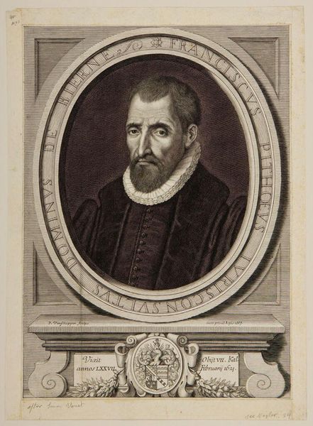 Editor: So, this is Anton Wierix II's engraving, "Jan van Broechoven, Burgomaster of Leiden." The sheer detail is incredible. I'm struck by the formality of the portrait, and how it’s framed by such elaborate ornamentation. What do you see in this piece, beyond the obvious representation of power? Curator: It’s more than just power, isn’t it? It’s about legacy. Look at the intricate border—almost like a family tree blooming around him, intertwining with his coat of arms. He’s not just a man; he’s an institution. What do you make of the Latin inscription? Does it hint at anything beyond the image? Editor: I think that it has something to do with aging, and the work that he has done. Curator: Indeed! It adds a layer of reflection. It is a reminder that even in the most meticulously crafted images, time marches on, transforming both the subject and our understanding of them. Editor: That’s a fresh perspective. I hadn’t thought about how the inscription interacts with the image itself. Curator: The best art always has layers, doesn't it?