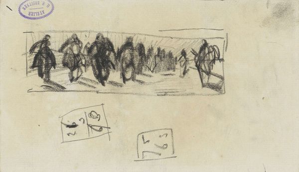 Curator: This is Louis Valtat's "Crowd/Street Scene." Valtat, born in 1869, captured daily life with bold color and energetic brushwork. Editor: It feels so fleeting, like a memory sketched in sepia tones. The figures blur together. Curator: The facelessness is quite striking, isn't it? This echoes Baudelaire's flâneur, lost and anonymous in the growing urban landscape. Editor: I see them as ghosts, trapped between worlds. It's about the feeling of being lost in a crowd, even when you're not alone. Curator: Perhaps Valtat is gesturing to the increasing alienation of modern life at the turn of the century. Editor: For me, it’s just a reminder that we’re all just blurry figures passing through. Curator: A poignant perspective on transience, wouldn't you agree? Editor: Absolutely, and with that, I think I am going for a walk in the park.