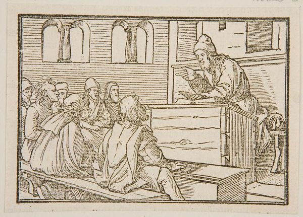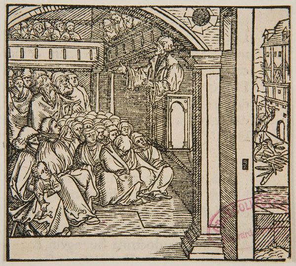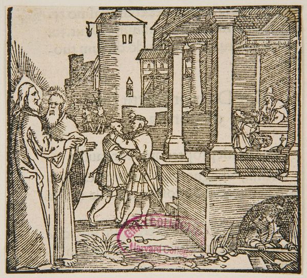 Curator: Hans Holbein the Younger, who lived from about 1497 to 1543, created this compelling woodcut print titled "2 Kings XI". It's currently part of the Harvard Art Museums' collection. Editor: Immediately, I'm struck by the stark contrast and dynamic composition. The dense hatching creates a dramatic sense of light and shadow. Curator: Indeed. Holbein uses this to depict a scene of regicide and succession. The figure being slain on the left, juxtaposed with the crowning ceremony on the right, reflects profound upheaval. Editor: The lines themselves, especially in the figures' drapery, create a sense of movement, despite the static medium. It gives the impression of unfolding action, like a freeze-frame from a play. Curator: The placement of the figures and architecture alludes to the enduring struggle for power, echoing through the ages. The act of claiming the throne and the cost of that claim. Editor: It's interesting how Holbein uses such simple means to convey such complex emotions, the dense network of cross-hatching giving such dimension. Curator: It really invites contemplation about the cyclical nature of history. Editor: Yes, the formal tension mirrors the historical drama.