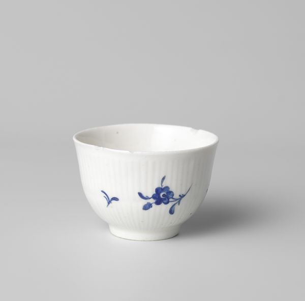 This cup, adorned with scattered flowers and leaves, was crafted in Loosdrecht. The delicate, blue floral motifs contrast elegantly against the pristine white porcelain. The cup's form, simple yet refined, invites contemplation on the interplay between functionality and artistry. The composition of the scattered floral design is of particular interest. Instead of a symmetrical, ordered pattern, the artist opts for a seemingly random arrangement. This evokes a sense of naturalness and spontaneity. Such asymmetry can be seen as a disruption of traditional decorative norms. The cobalt blue brushstrokes, each a distinct mark, create a visual rhythm that dances across the surface. This interplay between the regularity of the cup's shape and the irregularity of its decoration transforms this everyday object into a space for aesthetic and philosophical inquiry. Note how the negative space enhances each motif. Is it challenging our understanding of beauty?