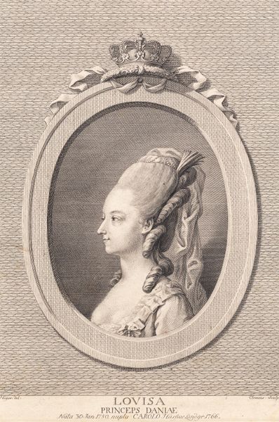 J.F. Clemens created this engraving of Kong Christian VII. The portrait presents a profile view of the King, framed by an oval border and topped with the royal crown. Christian VII ruled during a time of significant social and political change, including the influence of the Enlightenment and growing calls for reform. What does it mean to lead a nation when your own mental state is precarious? Christian VII was known to have mental health struggles, and while he remained King, he was seen as unfit to rule. Those around him, wealthy men from powerful families, maneuvered to fill the power vacuum. How might it feel to be a man, and a King, stripped of your agency? Consider the weight of the crown, both literally and figuratively, in a society grappling with evolving ideas of power and governance. This image captures a moment in time and also hints at the complex interplay between personal identity and the demands of leadership.