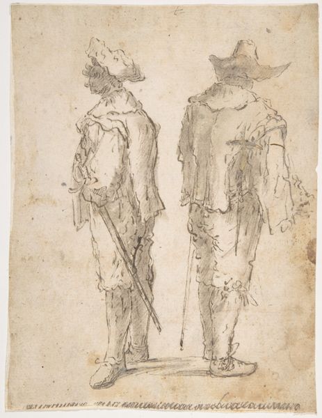 Editor: So this is Harmen ter Borch’s "Two Boys Walking on a Path by a Fence," from before 1677, using pen and pencil. I'm struck by how immediate it feels, almost like a snapshot. The rough, quick strokes give it such a sense of movement, of a moment caught in time. What's your take on it? Curator: It's compelling to consider the socio-economic implications embedded in ter Borch's choice of subject and medium. These are not idealized portraits of the aristocracy, but rather an observation of everyday labor, of boys walking and possibly herding animals. Notice the simplicity of the line and the directness of the composition – the work emphasizes the real and relatable labor involved in rural life. Does the humble nature of the materials—pen and pencil—impact how you perceive this depiction of laborers? Editor: Definitely. The common materials contrast so sharply with the polished works often shown at the time. You start to think about who *could* afford these grand paintings versus who is doing labor, in the fields and creating the very foundation of Dutch prosperity. It's thought-provoking! The labor of art itself is also more obvious because of it. Curator: Exactly! This rawness disrupts the artifice we often associate with Golden Age painting, bringing forward questions about artistic production. Who was ter Borch depicting? Who would have viewed it? How might it speak to the complex relationships between different social strata? By understanding that artmaking and materials always involve labor we recognize that even drawings are historical and social productions. Editor: It reframes the entire narrative, looking not just at "high art", but art’s role in daily life, society, even consumption! Thank you, this shifted my perspective. Curator: Indeed, thinking about it that way transforms how we look at artistic representations, understanding them as embedded within broader socio-economic contexts.