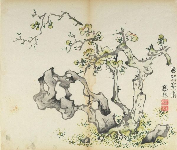 Editor: Here we have "Branch of Plum Blossoms" by Hu Zhengyan, from his Ten Bamboo Studio Manual. It feels so light and airy, like a gentle breeze. What do you see in this delicate illustration? Curator: It's more than just an illustration; it's a whisper of spring. Zhengyan, I think, wasn't just depicting plum blossoms, but the very essence of resilience and renewal after winter's harsh grip. Those pale pink petals against the stark branches... it's a visual haiku. Editor: That's beautiful! So, it's about more than just pretty flowers? Curator: Oh, absolutely. It's about finding beauty in the face of adversity, a theme deeply rooted in Chinese art and philosophy. It's a reminder that even in the bleakest of times, life, like these blossoms, finds a way. Doesn't it just make you want to believe in second chances? Editor: Definitely. I'll never look at plum blossoms the same way again! Curator: And isn't that the magic of art? To see the world with new eyes.
