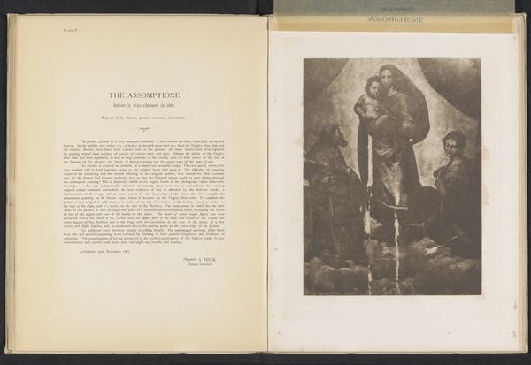 Curator: This image presents a collotype print, found within a publication from before 1877. The reproduction shows the heads of Christ and the Virgin Mary, after Quinten Massijs. The source print medium seems to be textile adhered to paper. What catches your eye first about this pairing? Editor: The symmetry is immediately striking—the mirroring in composition, even the parallel upward gaze. It suggests a relationship based on shared experience, yet they are isolated, contained within their own frames. It feels intentionally crafted to elicit comparison rather than connection, which is strange, but, also a deliberate way to explore power dynamics in Renaissance society. Curator: Indeed. The halos radiate, but they don't connect. Each figure is intensely individualized. The use of textiles in the original printing may point to themes of domesticity and labor, reflecting on women’s roles in that period. Quinten Massijs' work was groundbreaking at the time because he brought about great sophistication by blending meticulous detail and genuine feeling into the depiction of religious narratives. Editor: The halo iconography immediately anchors these images within a familiar Western visual vocabulary. Radiating lines, a universal symbol for divinity or enlightenment, create an almost overwhelming sense of importance for both. The downward, praying gesture of Mary feels passive in contrast with the direct gaze of Christ, hinting at pre-assigned roles that affect our contemporary interpretation of feminine expression and autonomy. The reproduction’s photographic element almost lends this a voyeuristic feel. Curator: Considering the date of the reproduction, such interpretations have always shifted through art historical eras. Its presence in print culture also invites analysis. By dissecting these holy heads, one questions conventional narratives associated with the Holy Family. It speaks to evolving attitudes toward women within patriarchal religious systems as art transforms alongside social and political views. Editor: It's a compelling reminder that even within sacred iconography, subtle gestures and deliberate framings can hold and expose complex undercurrents of gender, power, and humanity. Curator: Precisely; this layering is what prompts re-evaluation in historical dialogue through art. Editor: This has really made me think about how persistent symbols, even when divorced from their original context, can still carry incredible emotional weight.