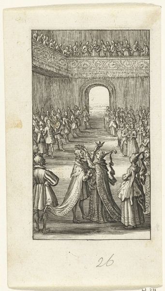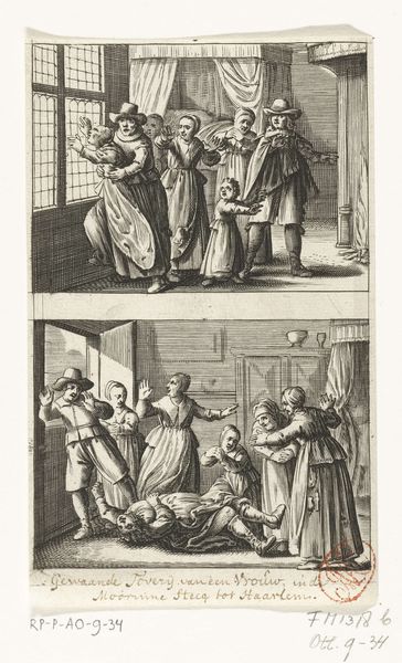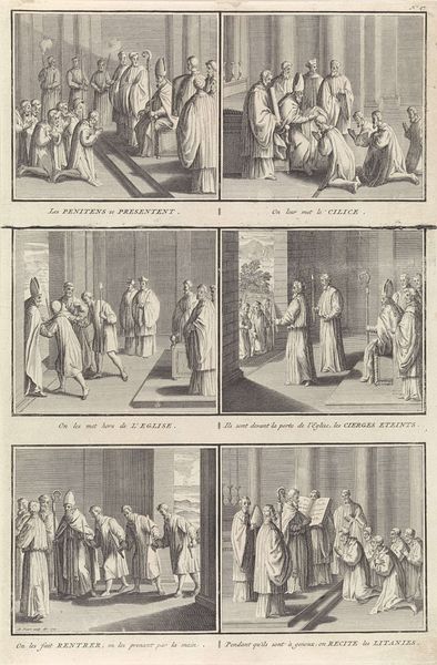 Curator: So, here we have "Viering van Aswoensdag en Eucharistie in de rooms-katholieke kerk"— Celebration of Ash Wednesday and Eucharist in the Roman Catholic Church. Bernard Picart created this print back in 1724. What’s your initial take? Editor: It feels... strangely observed. Almost like overhearing gossip through a keyhole. Two distinct scenes crammed into one frame, the solemnity of Ash Wednesday contrasting oddly with, what, a blessed bread ceremony? It's a peculiar juxtaposition. Curator: Absolutely. Picart, see, was deeply interested in documenting and critiquing religious rituals. He lived during the Enlightenment, when people were questioning established customs. This print is part of a larger project documenting various religious ceremonies around the world. Editor: It's as if he’s dissected two moments, laid them side-by-side, and said, "Look at the theatrics." The Ash Wednesday scene, folks kneeling for their ashes, almost theatrical in their reverence... then below, this almost casual passing around of bread. What does it all mean? Curator: He's inviting us to think critically about these acts. Consider the power dynamics, the social performance inherent in religious ritual. Think about the Reformation's questioning of holy objects and practices, how some considered bread just… bread. Editor: The details fascinate me. The way the artist captures light filtering through windows, the detailed costumes. It's precise, but the sheer volume of people gives it a chaotic edge. So, do you think Picart's mocking? Is it gentle ribbing? Curator: Neither, I believe. I think it is an inquiry into the visual symbols and power inherent to those. Look how he highlights the costumes, the objects – emphasizing that it's through objects and actions that meaning gets created. Editor: A cultural record and wry social commentary blended together then, quite the potent mix! Curator: Precisely! Picart compels us to reconsider our understanding of faith, power, and communal expression, reminding us that seeing, really seeing, is often a subversive act. Editor: A final thought, perhaps its commentary on the performative aspect of belief. Either way, something deeply relatable that makes you consider and question still today.