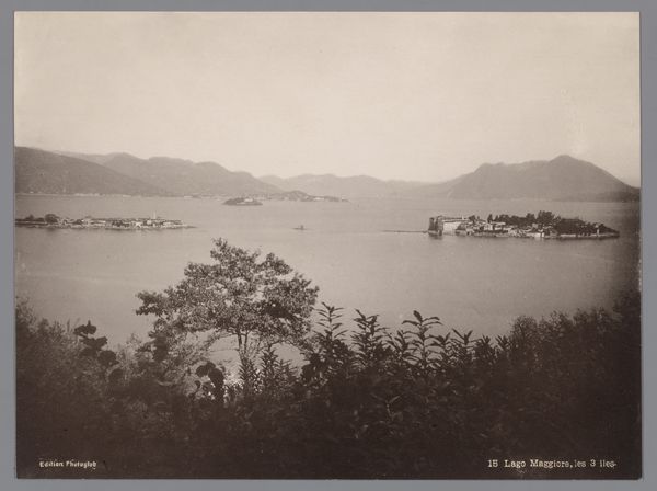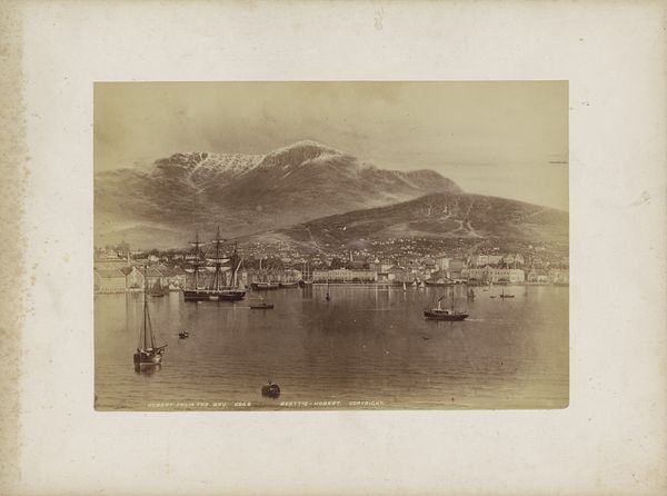 Editor: Here we have Jordão da Luz Perestrello’s photograph, “Tenerife,” dating circa 1860 to 1915. It appears to be a landscape photograph, showcasing the island, using a monochromatic palette. It evokes a sense of stillness. What elements jump out at you? Curator: Immediately, I’m drawn to the formal arrangement. Perestrello segments the scene into three distinct panels, and there is clear emphasis on the interplay between horizontal and vertical lines. Notice the mountains mimicking the sea's horizontal expanse, bisected only by the few masts. Editor: The segmentation does feel a little odd; why not just take one picture? Curator: Precisely! It calls attention to the medium itself. Consider how this triptych form compels us to visually piece together a singular image. We must engage with the construction of the photograph rather than passively receiving a straightforward representation. Look how the tonality of the water interacts from left to right panel. Editor: Ah, I see, it's not trying to hide the fact it is a photograph or collection of photographs. The ships are also a key part, acting as the mid-ground? Curator: Indeed. Their placement helps establish depth and scale within the composition, without diminishing from the water's importance. Perestrello emphasizes a flat, nearly two-dimensional perspective through careful arrangement. The photograph acts as a metaphor for visual experience itself. How do we, as viewers, construct our perceptions of the world? Editor: That’s fascinating, I was too busy looking for the actual place, not at how it was constructed. I’ll definitely think differently about photographs going forward! Curator: A closer formal reading can often reveal unexpected insights and deeper levels of meaning within any artwork.
