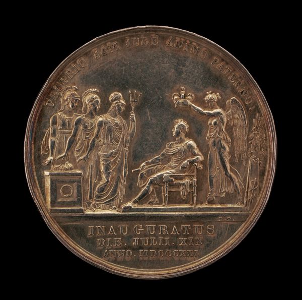 This bronze medal was made by Mathias-Nicholas-Marie Vivier, likely in 1823, and presents the allegorical figures of Justice and Faith on its reverse side. The medal was die struck – a process involving hammering metal between two hardened steel dies. This technique enabled the relatively efficient production of multiple, identical commemorative objects. Its smooth, reflective surface, combined with the sharp relief of the figures, is characteristic of this process. Note how the inherent qualities of the bronze—its weight, color, and capacity to capture fine detail—contribute to the medal's overall impact. The inscription and imagery suggest it was commissioned to commemorate a solemn event, possibly the restoration of religious practices. The figures of Justice, with her scales, and Faith, with her cross, evoke core values of post-revolutionary society. By focusing on materials, making, and context, we can appreciate how this object transcends mere decoration, reflecting deeper social currents.