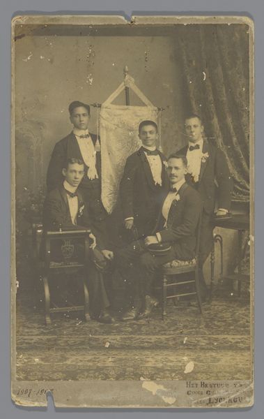 This is a group portrait of an unknown family with a violin on a table, by Hartog Philippus van Adelsbergen. This photograph uses sepia tones that give the image a warm, antique feel, doesn't it? It's like looking at a memory, softened by time. The surface is pretty smooth, but if you get up close, you can see the tiny variations in the paper, a reminder of the physical process involved in making this thing. I find myself drawn to the faces in the image. Each one seems to carry a story, yet they remain unnamed, unknown. It reminds me of the way we all carry our own histories, visible in our expressions, yet often unread by others. This relates to how art is an ongoing conversation where ideas are exchanged across time. It embraces ambiguity and multiple interpretations over fixed or definitive meanings.