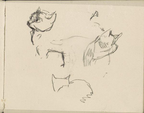 Curator: The artwork before us is titled "Zonder titel (twee schetsen liggend veulen)," created by Leo Gestel between 1935 and 1936. It’s an ink and pencil drawing currently housed in the Rijksmuseum. Editor: The sketches are so delicate, yet the bold lines give them a strong presence. The foals look so peaceful, almost melancholic. What do you see in this piece, beyond the surface depiction of animals? Curator: Gestel created this in the lead-up to WWII. We must consider the political climate of the late 1930s and the impending sense of dread that permeated society. These vulnerable foals can be seen as a metaphor for innocence threatened by external forces. How might their recumbent postures reflect the societal anxieties of the time? Editor: That’s an interesting perspective. I hadn’t considered that. They seem more like symbols of naive vulnerability. Do you think Gestel intentionally imbued them with a political message, or is it more of a subconscious expression of the era's fears? Curator: It’s likely both. Artists rarely exist in a vacuum. Their work often absorbs and reflects the societal undercurrents, whether consciously or unconsciously. Gestel, deeply affected by the rising tide of fascism, might have used these sketches as a subtle commentary on the fragility of peace and freedom. Note how the harsh lines contrast with the foals' tenderness – a visual tension mirroring the era's anxieties. Editor: So, reading this artwork means understanding the dialogue between the artist’s emotions, his life experiences, and the broader context of that turbulent period. Curator: Precisely. The personal and the political intertwine. Looking at art, especially from such pivotal periods, invites us to understand and make meaningful the complex interplay between art history and contemporary social theory. Editor: It changes how I’ll perceive artwork from now on! Curator: And hopefully prompts you to interrogate the historical narratives surrounding identity, power and visuality.