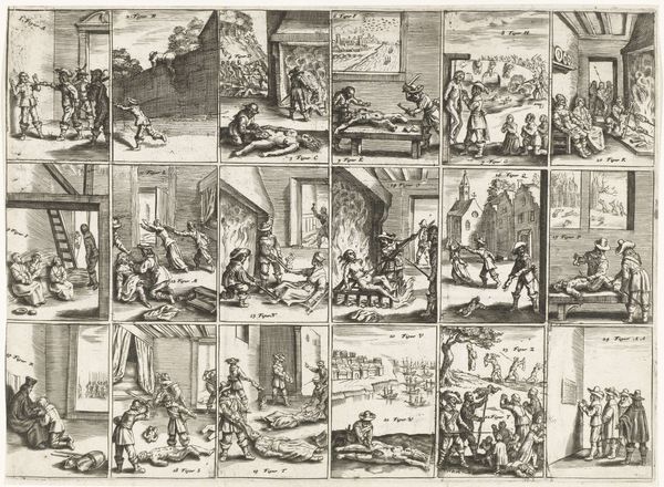 Curator: The artwork we're looking at is an engraving from around 1664, entitled "Allegory of the advantages for the Turks from divisions among the Christian nations." The piece is by an anonymous artist, reflecting on a complicated moment in European history. Editor: Well, my first impression is that this is rather bleak. There is an ordered division within each section—twelve scenes arranged like windows in a pane. The light and shade highlight a world of paranoia, fragmentation, and underlying hostility. Curator: The artist employs an allegorical mode, representing abstract concepts through scenes of everyday life, largely involving dogs. For example, we see scenes representing care ("Zorg"), greed ("Raad"), loyalty ("Trouw"), and strife, all impacting the broader dynamic between Christian nations and the Ottoman Empire. It seems to warn about how division provides an advantage to external forces. Editor: I see that contrast echoed visually, most striking is the division of space—the picture plane cleaved into rectangular modules. This enforces the allegorical point. But more interesting for me is the density and complexity, creating areas of visual stress against moments of clarity. Curator: Exactly! Note how the artist uses animals to communicate meaning. The behavior of these animals clearly reflects negatively on the actions of people, perhaps highlighting a base impulse at play or mirroring social dysfunction. The choice to include text provides another way of explaining or illustrating the meaning behind those visual allegories. Editor: Those miniature scenes! How meticulously rendered. But the overall effect, that interplay of miniature theatre and didactic text, feels overwrought and slightly pedantic. One senses a desperation to control and define meaning in a world seen to be coming apart. Curator: And a deep pessimism in those claims... Though in historical context, tensions within Christian Europe were constantly manipulated by outside powers such as the Ottomans. Perhaps this visual warning sought to foster unity against the ever-present threat. Editor: Ultimately, it speaks of fear, doesn't it? Fear rendered with great technical precision and a rather heavy hand. A fascinating, if slightly suffocating, demonstration of anxiety in pictorial form.