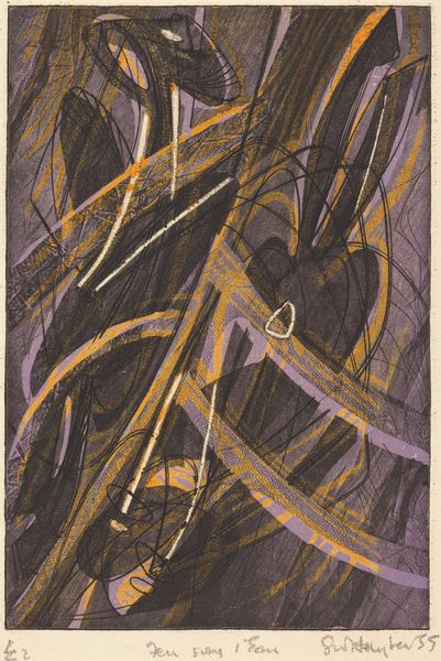 Editor: We’re looking at “Reconteur,” a 1951 print by Stanley William Hayter. The overlaid lines in orange, purple and teal give the image a real sense of chaotic energy. What do you see in this piece? Curator: As a historian, I'm fascinated by how Hayter, a key figure in Atelier 17, impacted the development of printmaking and Abstract Expressionism in New York. The term 'Reconteur' suggests storytelling, doesn’t it? Editor: It does. It's about telling stories or relating anecdotes, which seems surprising considering it's an abstract work. Curator: Exactly! So how does a non-representational piece ‘tell’ a story? This print challenges traditional notions of narrative in art. Hayter and Atelier 17 were instrumental in promoting printmaking as a serious art form, not just reproduction, emphasizing its potential for artistic innovation, after all. The chaotic lines can symbolize fractured memories, fragmented histories… it echoes the post-war uncertainty influencing abstract expressionists at that time. Does it feel as such? Editor: That makes sense. Seeing the chaotic energy as a reflection of societal anxiety does resonate. I initially saw the abstraction as purely formal, but framing it within the post-war period shifts my understanding. Do you see how Hayter used printing to create movement in his works? Curator: Yes, but notice the tension in the composition, it is an expression of modernity. This aligns with abstract expressionism’s focus on subjective experience. It suggests the complex socio-political realities that shape art. Editor: I'm beginning to see it less as random lines and more as a coded language reflecting its time! I was purely looking at the form, now, I’m thinking of history. Curator: Precisely. Considering the socio-political climate helps unlock richer interpretations! The intersection of artistic expression, technological innovation and historical context adds to a deeper analysis of artworks like "Reconteur.”