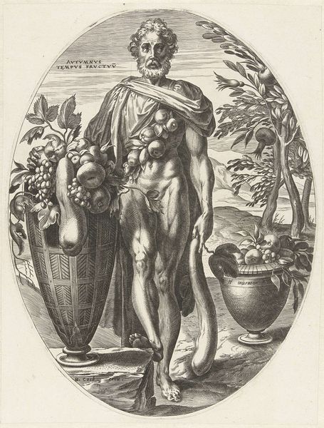 Robert Boissard created this print, "Hercules, plate 16 from Parnassus Biceps," likely in the early 17th century, using the intaglio process. This involved engraving lines into a metal plate, inking the surface, and then wiping it clean, so that ink only remained in the etched lines. When pressed onto paper, the image is transferred. Look closely, and you'll notice the crisp, precise lines that define Hercules' muscular form, as well as the intricate details of the surrounding figures and foliage. The intaglio process requires considerable skill and patience. Each line had to be carefully etched, reflecting the engraver’s technical mastery. Prints like this one were made in multiples, making images accessible to a wider audience. This reproductive technology allowed for the widespread dissemination of artistic ideas during the Renaissance, contributing to the era’s intellectual and cultural ferment. By focusing on the material process, we can appreciate how this image participated in the wider world of labor, skill, and the circulation of knowledge.