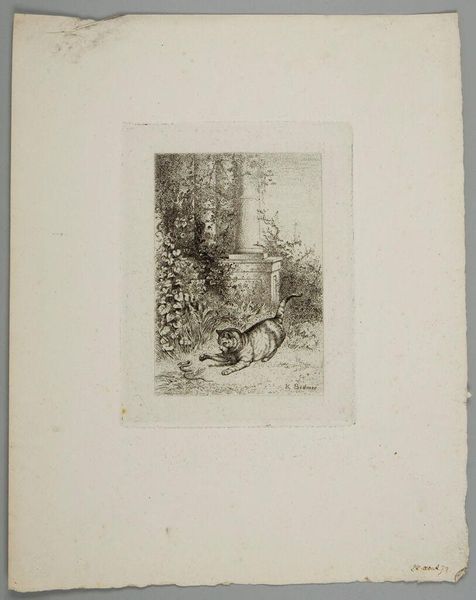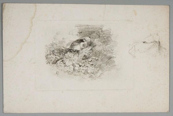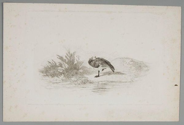 Editor: This is Karl Bodmer's "Ducks," a small etching. It feels like a fleeting observation, a peaceful gathering. What do you see in this piece beyond its literal subject? Curator: I see a subtle commentary on the relationship between humans and nature. Consider Bodmer's involvement with the American West; this seemingly simple depiction of ducks could be read as a statement on land use, or even the disruption of indigenous ecosystems. How might this image relate to broader issues of environmental justice? Editor: I hadn't considered that! It's fascinating how a small artwork can hold so much weight. Curator: Absolutely! Art often reflects and refracts the social and political landscapes in which it is created, encouraging us to question our place within them.
