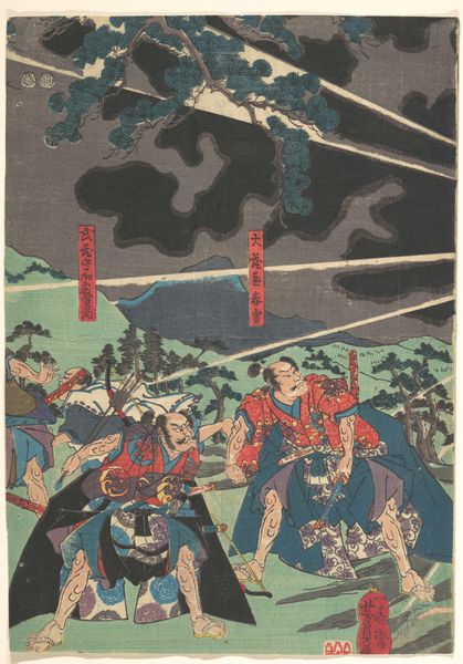 This is a woodblock print made by Utagawa Yoshikazu, a Japanese artist who worked in the 19th century. Immediately, one notices the stark contrast and dynamic composition. The dragon, rendered in dark tones, emerges from a swirling vortex of stylized waves, a traditional motif in Japanese art. Yoshikazu plays with the visual push and pull between representation and abstraction. The waves are depicted as patterns, almost geometric in their repetition, yet they still convey a sense of turbulent motion. The rays emanating from the dragon’s mouth create diagonal lines, adding tension to the scene. The structural framework here emphasizes a cultural understanding of chaos and power. The dragon, a potent symbol in East Asian cultures, dominates the composition, its form almost blending with the storm. This fusion challenges fixed meanings by presenting the dragon not just as a mythical creature, but as an embodiment of natural forces. The print invites us to consider how visual forms can destabilize established categories and engage with new ways of perceiving the world.