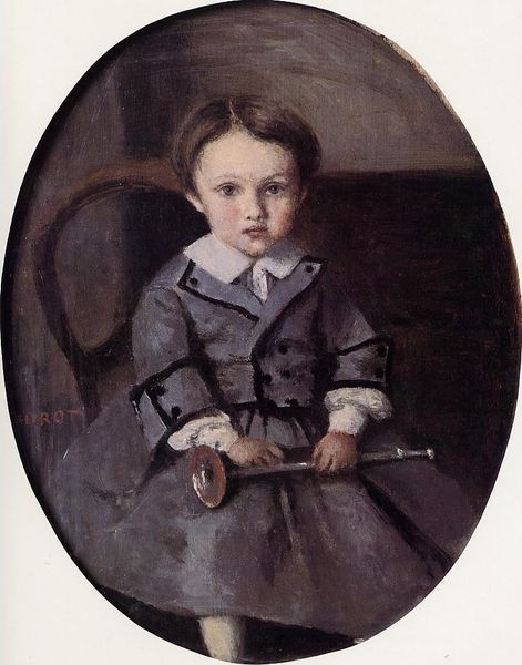 Curator: Oh, what a fascinating example of Courbet's early style. Here we have "Juliette Courbet," a painting completed in 1844. The artwork resides here with us at the Petit Palais, a jewel made with oil paints. Editor: Hmm, my first impression? A tender yet slightly melancholic aura seems to surround this young woman. The muted tones evoke a sense of introspection. She seems rather stiff sitting in her chair. Curator: I think it’s interesting how Courbet toes the line between Romanticism and Realism. There's a sentimentality in the subject matter—his sister—but also an almost brutal honesty in her presentation. Her expression isn't idealized, nor is her setting overly romanticized. Editor: Right. There is an arresting balance of light and shadow here, creating depth but also an unsettling stillness. Observe how the patterns of the curtain behind her are reflected and echoed by the stripes of her dress, leading the viewer's eye back to her composed facial expression. It's almost like the external ornamentation distracts one from her. Curator: Yes, I find it interesting when juxtaposed with the lush realism movement that would become his signature, such works almost give the impression of an artist flexing. I see elements that, at that time, nod to traditional portraiture. The chair, the fabric. Her upright posture suggests the constraints imposed on young women. Editor: True, but look again! The hands are carefully posed to suggest relaxation and, maybe, acceptance of that restrictive world around her. Her pale skin and flushed cheeks draw focus, while the composition is strategically organized so the figure's clothing contrasts slightly against its immediate background for dramatic effect. A little rebellion, if I may. Curator: Rebellion! A rebellious rose blooming amidst societal expectations? Oh, I love that. To imagine Courbet using a portrait of his sister to hide such complex visual messaging fills me with a warm sort of feeling, thank you! Editor: Well, on close inspection, the artist's structural arrangement adds many layers of narrative depth beyond mere physical portraiture, doesn’t it?