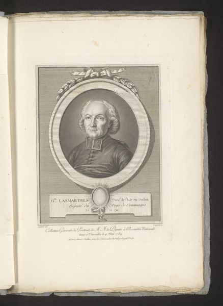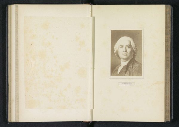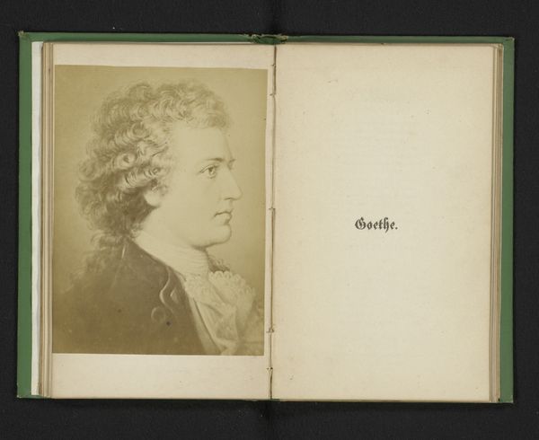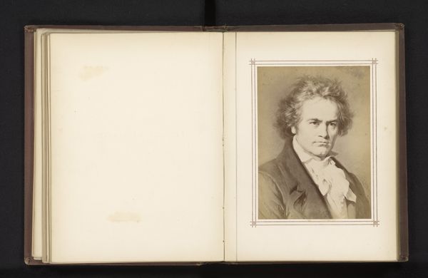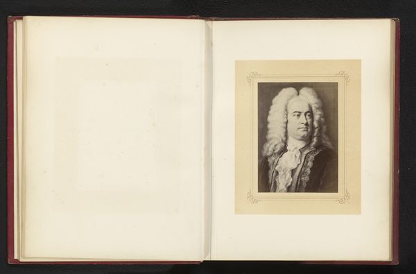 Curator: So, here we have what's described as a "Fotoreproductie van een geschilderd portret van Johann Sebastian Bach door Carl Jaeger," a photographic reproduction, made before 1872, of a painted portrait. The medium is gelatin silver print. Editor: My goodness, talk about meta! It’s a copy of a copy, and yet somehow, even through the layers of reproduction, you still feel the weight of history in this image. There's something melancholic about it, isn't there? All those shades of gray... and then he's trapped in this little ornate box inside a bigger box, a book. It's Bach in a nutshell. Curator: It does create a sense of historical distance, framing him in a way that speaks to the formal portraiture conventions of the 19th century, which heavily romanticized the past. And reproductions like these helped cement a certain kind of image of Bach, as this almost mythic figure. It’s also an interesting statement on art and its availability to the masses – this print brings Bach into parlors where an original portrait would never go. Editor: You put it so academically! I think I love this object exactly BECAUSE it is so many times removed! It takes the original subject into the realm of something else entirely. He transcends and diffuses... he IS everywhere at once, like his music! Do you think Herr Bach ever imagined being quite so reproduced and framed? He must have just been doing the music because he had to, you know? Curator: Doubtful he considered the ramifications of reproducible imagery on his legacy, but one could argue his own careful archiving of his compositions shows some foresight. And that's precisely what's intriguing. It demonstrates how the public's perception of even monumental historical figures like Bach gets continuously reshaped through layers of reproduction, interpretation, and dissemination. His genius becomes almost secondary to this symbolic presence in popular imagination. Editor: It makes one think about all of us, what aspects will linger from this modern existence? And in what crazy mediums, huh? I suppose Herr Bach has landed quite well in our era of endless streaming and social reproduction. Thanks for pointing out what that image is doing inside all that framing, not just sitting there playing harpsichord for royalty.