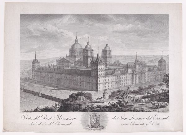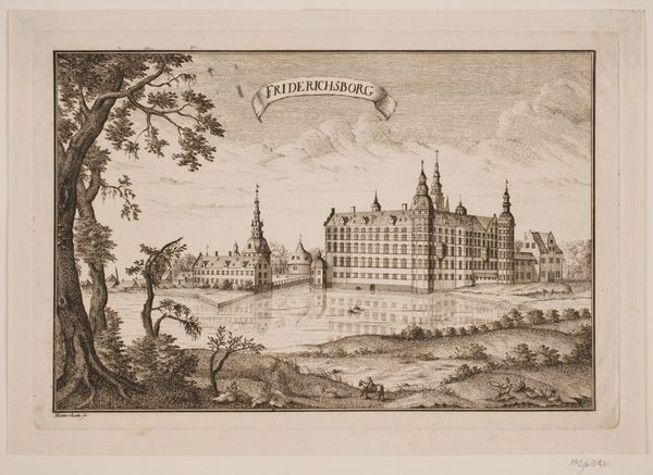Editor: Here we have "Frederiksborg Slot," an engraving by Michael Fosie from 1745, currently held at the Statens Museum for Kunst. The level of detail is remarkable, especially given the printmaking technique. What strikes me is how the artist uses the contrast between light and shadow to create depth and interest. What do you see when you look at this piece? Curator: Initially, one must observe how Fosie employs linear perspective. The architectural subject is framed with dense foliage, creating distinct foreground and background. Do you observe how the intricate linework of the architectural rendering differs in density, weight, and direction, compared to the lines delineating the foliage? Editor: I see it now! The lines used for the trees are more organic, varied in thickness, while the architecture is defined by finer, more uniform lines, creating a sense of order and precision. What does this distinction signify? Curator: Precisely. Consider how the reflection of the building interacts with its physical form. Is it a perfect mirror image? No. It wavers. This asymmetry undermines a rigid structural reading and activates a dynamism across the composition. Ask yourself what the artist may be subtly conveying by disturbing the very structural integrity he outwardly attempts to demonstrate? Editor: I hadn't considered that the slightly distorted reflection actually introduces a kind of tension or movement. It stops the image from being just a static depiction of architecture. Thanks, I will definitely pay more attention to that relationship between what is stable versus more ephemeral. Curator: Indeed, thinking of art in this way, as forms in relation, always yields greater clarity in analysis.