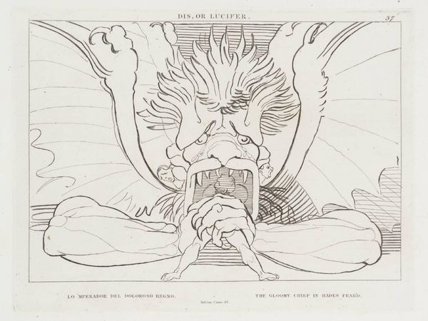 Curator: John Flaxman's "The Adoration of the Trinity," housed at the Tate, presents a fascinating study in devotion. Its stark lines and composition create an immediate impression. Editor: It feels unfinished, almost like a sketch. The weight of the figures in contrast with the ethereal lines gives it a solemn, mournful feeling. Curator: The image employs classical Christian symbolism. The dove, of course, represents the Holy Spirit, emanating from the radiant triangle symbolizing the Godhead. The draped, winged figures add a layer of complexity. Consider the impact of this work within its religious and social context; it invites contemplation on faith and redemption. Editor: It is fascinating how Flaxman used simple lines to create a sense of depth and movement. This piece makes me think about the labour involved in etching and the social history embedded in the production of religious imagery. Curator: Exactly. Seeing this reminds us of the power of art to reflect and shape cultural beliefs. Editor: Indeed, a powerful reminder of how artistic practice intersects with both material and spiritual worlds.