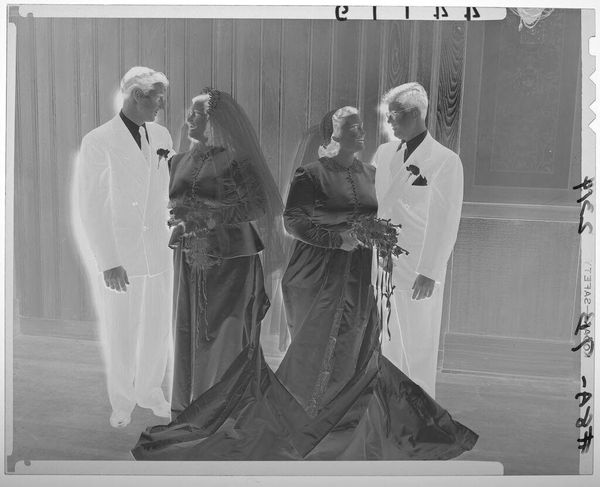 Editor: This is an untitled photograph by Peter James Studio, showing beauty queens with potatoes. The juxtaposition of glamour and…potatoes is striking. What do you see in this piece? Curator: I see an exploration of labor and value. Potatoes, humble sustenance, presented by figures adorned in symbols of beauty. It's an intriguing commentary on the means of production being presented by the symbols of idealized consumption. Does the method of production change our perception? Editor: That's fascinating; I hadn't considered it in that light. Thanks! Curator: It's a reminder that even beauty is constructed through material processes.