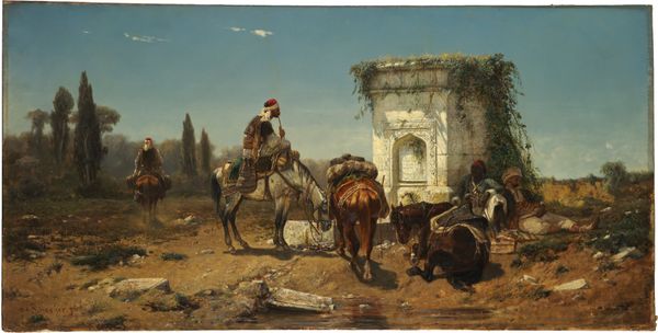 Editor: Here we have Willem de Famars Testas's "Turkse ruiter in een stad," painted in 1863, and done in watercolor. The details really draw you in, and it makes me think of stories from the Arabian Nights. How do you see it? Curator: The painting's visual power rests in its contrasting textures and geometries. Observe how the artist uses the rigid verticality of the buildings to frame the softer, curvilinear forms of the rider and horse. Editor: That’s interesting; I was so focused on the rider that I missed the buildings. Curator: And consider the textures. The rough, granular quality of the stonework, rendered with visible brushstrokes, contrasts with the smoother surfaces of the rider's clothing and the horse's coat. Do you see how the play of light and shadow accentuates these differences? Editor: Yes, especially the light on the horse’s flank. Is that typical for this type of painting? Curator: Orientalist paintings often prioritized meticulous detail and contrasting textures to create a sense of authenticity and exoticism for their European audiences. Notice the artist's controlled brushwork—evidence of a careful strategy of artistic production. Editor: So, beyond the surface-level story, it’s the formal elements that give the work its real weight. I guess I usually look for narratives first. Curator: Indeed, a work's formal aspects grant it meaning that surpasses simple storytelling. Paying close attention to the arrangement of line, color, and texture, gives us far deeper insights into its nature. Editor: Well, I will definitely keep that in mind next time I approach a painting. Thanks for showing me a new way of appreciating it. Curator: It was my pleasure; a deeper understanding lies in seeing rather than simply looking.