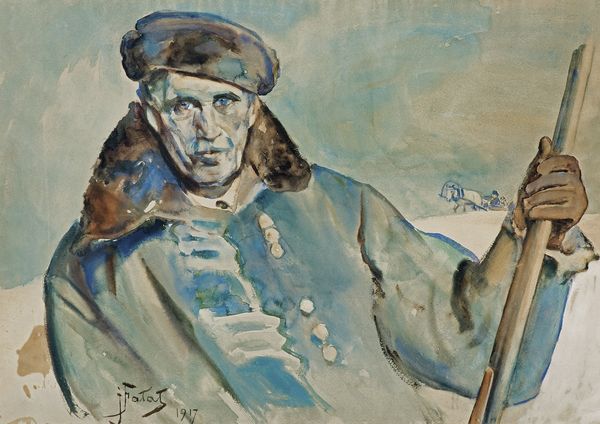 Curator: What strikes me most is how immediate and unfiltered this watercolor self-portrait by Julio Gonzalez feels. The expressive lines, the intensity of the gaze... Editor: It’s a stark image, definitely. The blues and browns give it a somber tone, like a figure burdened by something. Is there a particular reason Gonzalez chose this palette? Curator: Gonzalez, a sculptor, had to deal with the socio-political atmosphere of his time, with the rise of fascism and the Spanish Civil War looming. He might have been portraying his own anxieties. Editor: Yes, the weight of the world is evident in those furrowed brows and penetrating eyes. It is almost archetypal, and one can sense the weight of history in that gaze. Curator: And this work is currently housed in the Tate collection, a museum that plays a vital role in shaping our understanding of modern art and making it accessible to the public. Editor: It is fascinating how the symbols of worry are universal, independent of context or time. We are all vulnerable to these feelings. Curator: Indeed. It is a thought-provoking work that reminds us of the artist’s era, but also how we, too, cope with our times. Editor: A powerful reminder that art can transcend generations, expressing timeless truths about the human condition.