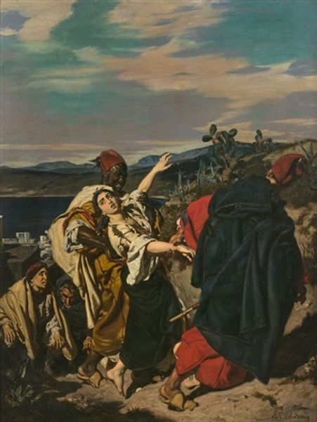 Henri Lehmann captured this scene from the Book of Tobit with oils, presenting a powerful moment of familial reunion. The embrace, central to the composition, speaks volumes, doesn't it? This gesture transcends mere greeting; it embodies relief, joy, and the restoration of familial bonds. Consider the symbolism of the embrace throughout history. From classical depictions of lovers to the prodigal son's return, it consistently represents reconciliation and love. But its presence here carries a particularly potent charge, loaded with cultural memory. Lehmann taps into something primal, a shared subconscious understanding of human connection. The act of embracing returns time and again, across epochs, evolving with each new portrayal, yet retaining its core essence. Here, it’s charged with an emotional intensity that resonates across time, engaging us on a deep, subconscious level. It’s a testament to how certain gestures become ingrained in our collective psyche. This embrace, a timeless motif, resurfaces, evolves, and takes on new meanings, proving its enduring power through the ages.